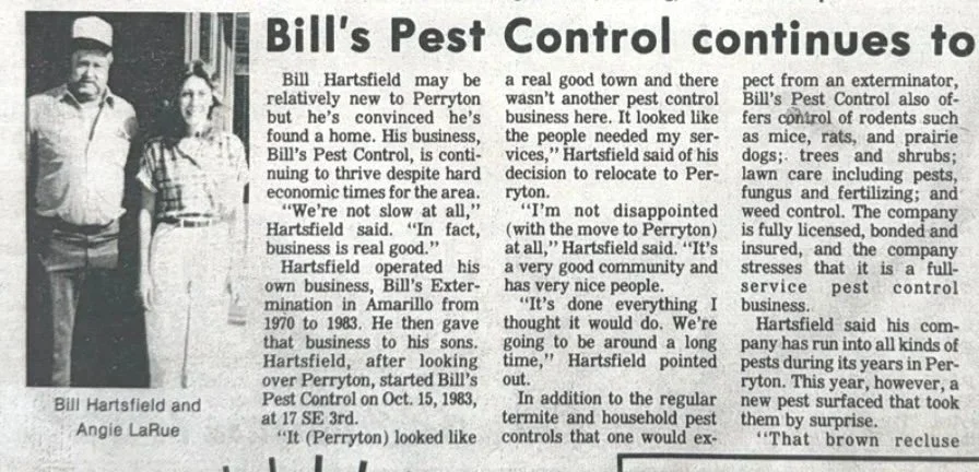 The business was originally started by Hunter’s father, Bill Hartsfield in 1983. Now, Hunter and Tammy Hartsfield have proudly owned and operated Bill’s Pest Control in Perryton, TX has continued as a trusted family business serving the community for decades.